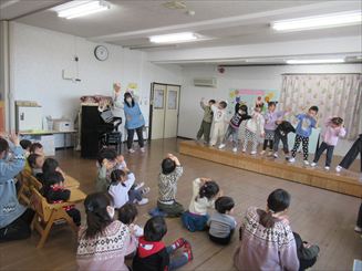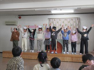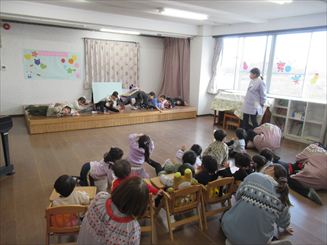 「お兄さん、お姉さんたちが『おおかみと7ひきのこやぎ』の劇をみせてくれました」